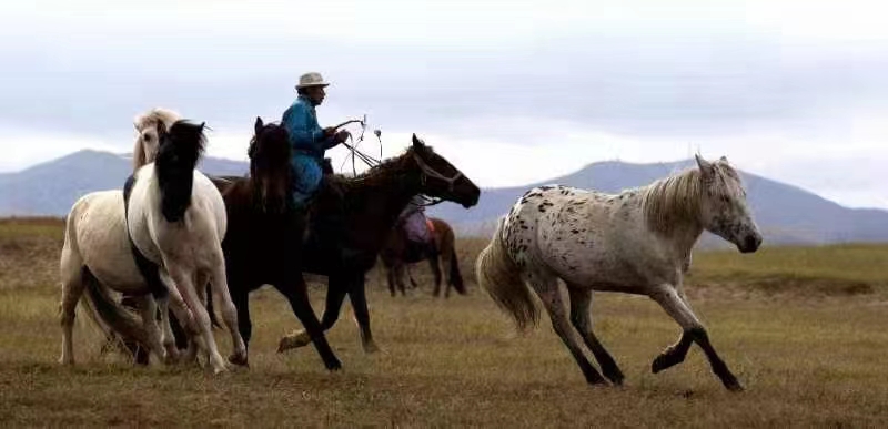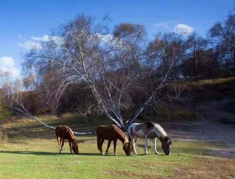 这时,我们缓缓爬上一个山头,扶额愿望,太阳静静的照在对面的山岗上,铺面而来的美景让你目不暇接。莽莽苍苍的白桦林,绿茵茵的大草原,羊群在山上漫步,马群在草原上奔跑,牛群在路上溜达,骆驼在林子里转游。本来我该浓墨重彩,大书特书这样的美景,但面对这样的美景,除了目瞪口呆,我失语了,我真的无法用语言来描述蒙古草原的美。我们用相机不停地闪烁,把这一暮暮安逸的山水画摄入镜头。