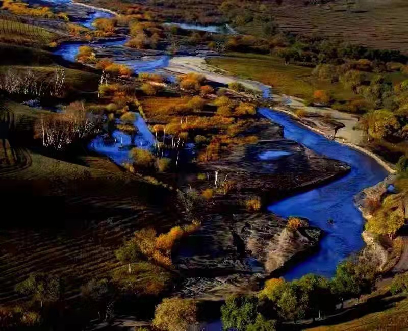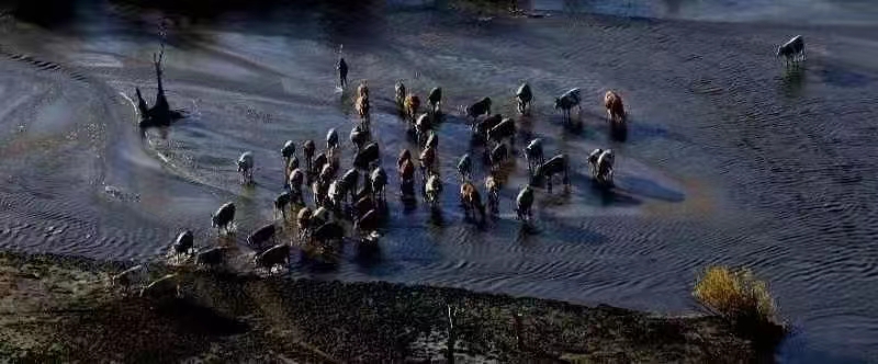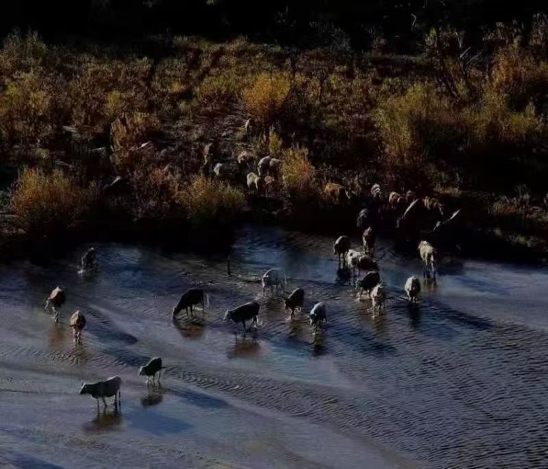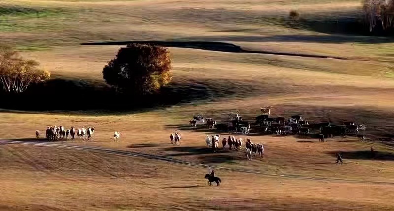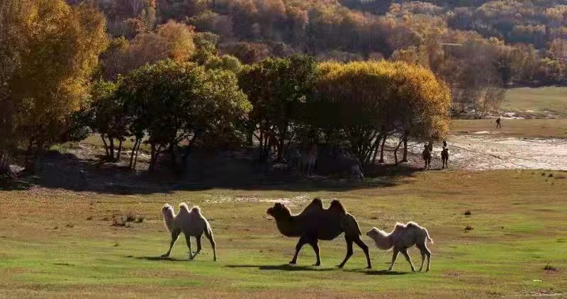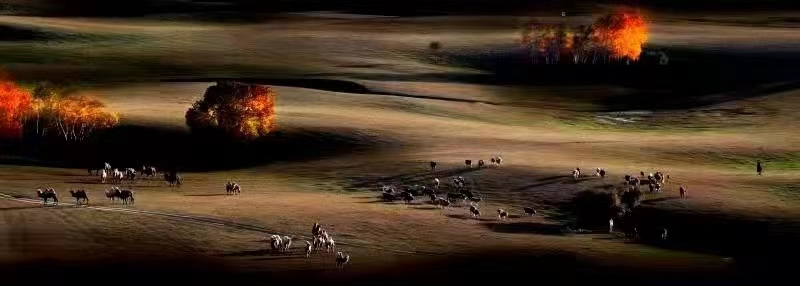 河水像一条玉带镶嵌在绿油油的大地上蜿蜒盘旋,河水又清又亮,草原上的任何一条小河都可以营造成这样的绿洲,带来一片欣欣向荣,万千色彩,勃勃生机,温情的小路把我们的心情引向诗与远方。如果说金黄色的白桦林是美丽草原的天然点缀,那么骏马,牛羊,骆驼这些驰骋在草原上的生灵就是草原的灵魂,而草原就是这些生灵的归宿和天堂。如果说白桦树是我们镜头下静止的风景,那么这些生灵就是我们镜头下流动的风景。草原上成群的牛羊,奔跑的骏马,在林中转悠的骆驼都是我们拍摄的主题。它们和蒙古高原上的山丘、溪流、湖泊、树林组成了一幅幅美丽的画卷。