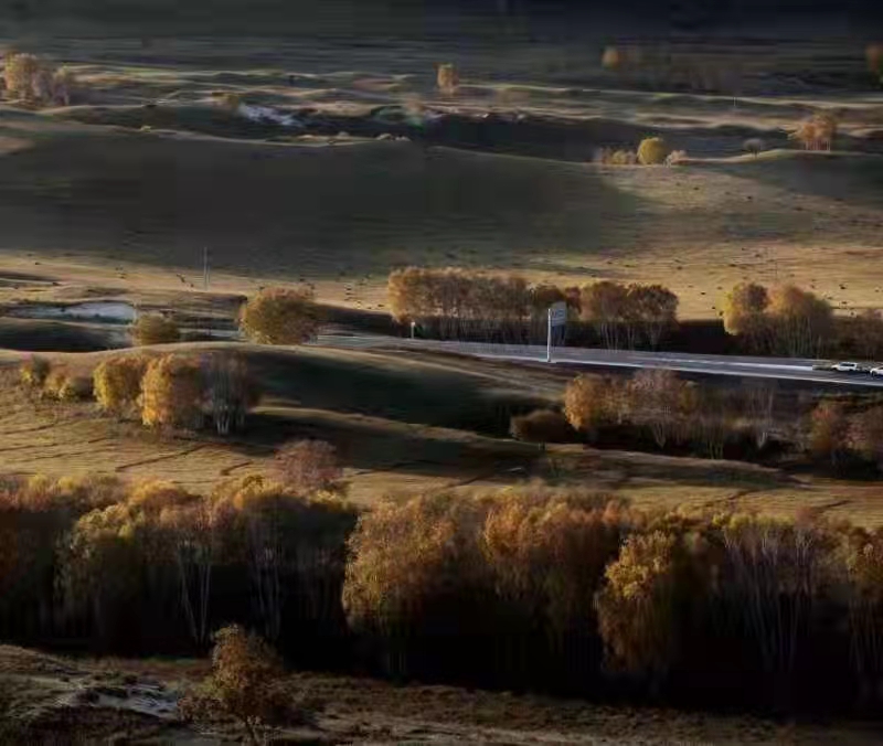 又过了一会,黎明流过,薄雾飘去,大地苏醒,草原逐渐露出真容,阳光照射下的白桦林,生灵抖擞,整个山岭在金黄色白桦林的点缀下,刹时好看,熬包吐就是一幅美丽的风景画,身临其境,我们真正体会到了,天穹压落,云欲擦肩,与大自然融为一体的那份悸动。