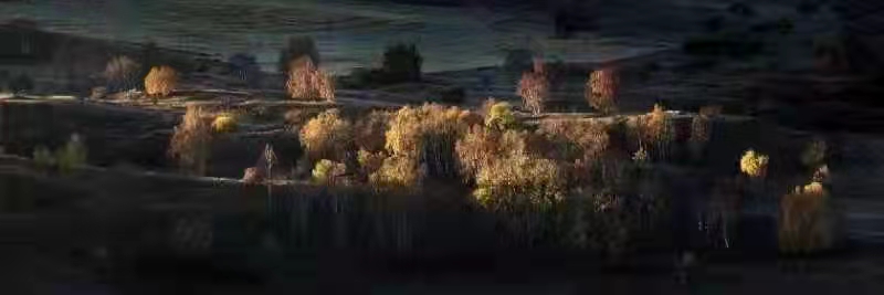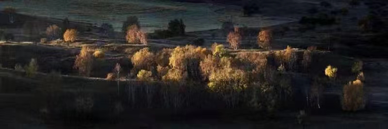 此时拍摄的人开始陆续散去,太阳照在对面的山岗上,一望无际的大草原便展现在我们的面前,白桦树及各种树木散落的山川,湖泊,溪流,白桦树一片金黄,远近山峦、层峦叠嶂,山脊线很美,起伏跌宕的山峦大气磅礴,又不失舒缓柔美。我还在纳闷,别人拍好都散了,王老师怎么还不叫我们拍摄,只见王老师突然挥动手臂,像一个运筹帷幄的将军,大手一挥指向光影的地带,“开始拍摄。”