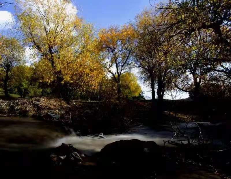 金黄色的白桦树的树叶,在阳光的照射下,鲜艳无比,阳光把树叶打得透亮,王老师说:“现在光线开始变强烈了,如何用光就特别重要了。”他选好侧逆光的位置,叫我们拍眼前的这颗树,用广角拍树的整体,再换长焦拍树的局部,有的树叶被打亮,有的还是原有的颜色,用横构图,接着又用竖构图,把这颗树完整的表现出来。王老师说:“如何发现美,拍得更美,是每一个摄影人的必修之课。”